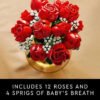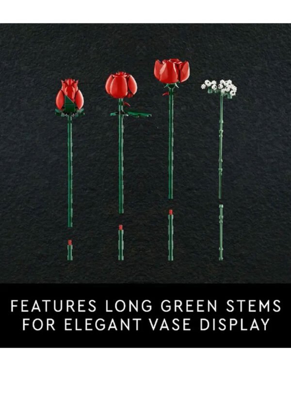 What’s in the box – This creative building set includes everything you need to craft a dozen red roses with long green stems, plus 4 sprigs of baby’s breath with small white flowers