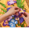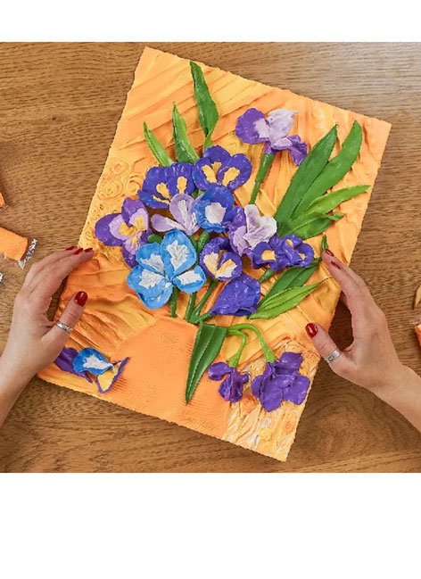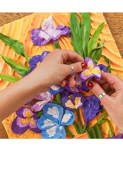 Apply your unique pattern on the background. Create deep embossed stripes with smooth movements, add waves with fingertips, apply a ball of mass and twist it with a stack. Unleash your imagination. Put a piece of your magic in the flowers. Create colored petals, wrap them in your love and the green stem of Iris. Every creation of nature is unique – allow yourself to experiment. A few petals fell off and remained lying near the vase. Beauty is not eternal, but you can immortalize it.